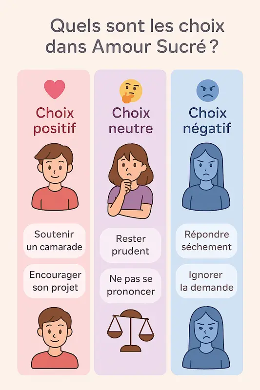 • Un choix négatif réduit l’affection et peut bloquer certaines scènes.